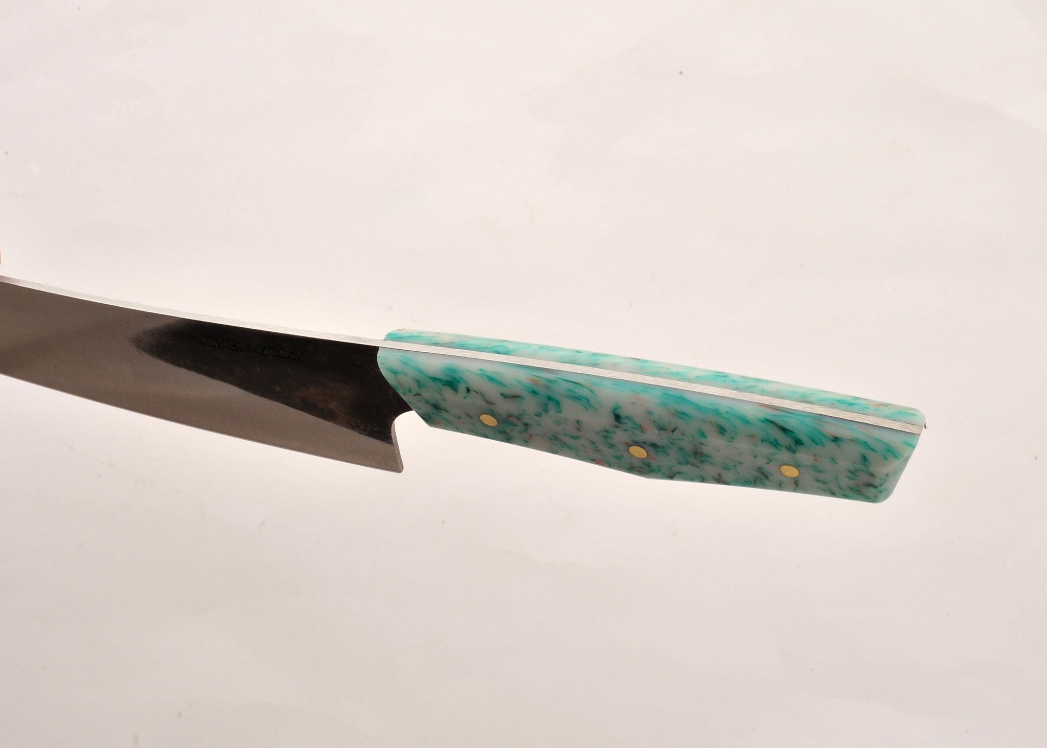 The Daily Kererū is made from Swedish carbon steel, which is produced from recycled saw blades. The handle is handcrafted from Critical's Cleanstone material made from 100% recycled plastic packaging and commercial fishing nets - giving it a swirling pattern. Three brass rivets hold together the blade and the handle, producing a simple design which suits any kitchen.